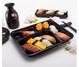LET YOUR FOOD SHOW DIFFERENT BEAUTY WITH OUR FULL RANGE OF DISPOSABLE SHUSHI TRAYS, BENTO BOX & CHIOCE OF GENERIC PRINT BIO- PAPER SUSHI BOXES